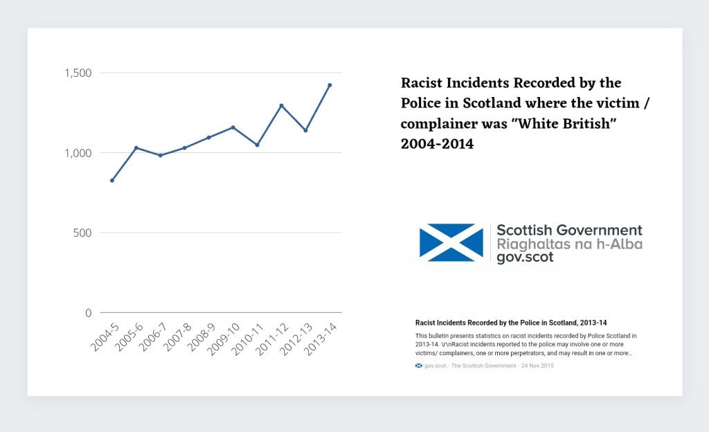 They do, however, record a spike in racist incidents where the police were involved and the victim or complainer identified as “White-British”. Indeed, to our shame, ‘White-British’ rose as a demographic to equal Pakistani as the most likely to be a victim or reporter of a racist incident.