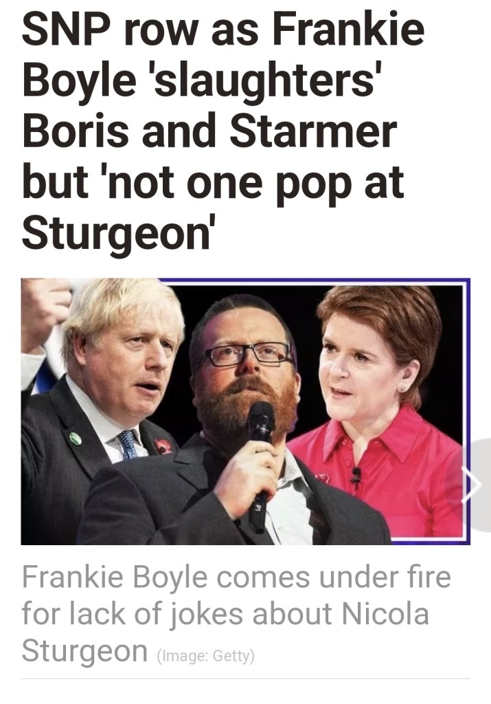 This is further exacerbated by the fact that some of the most visible of the country’s comedians and satirists are seen as loyalists to the SNP regime. As we shall see: Janey Godley, for instance, is often criticised for her lack of cutting-edge humour and close ties to the Scottish Government.