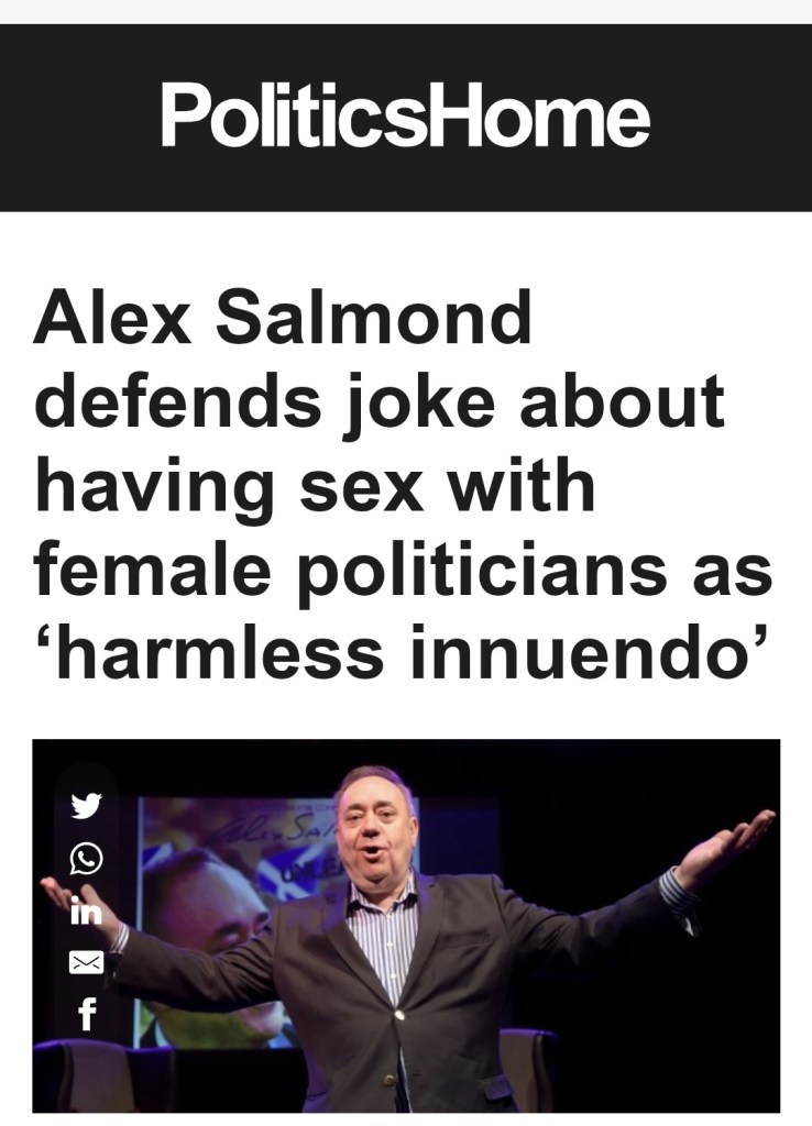 Despite the backlash, Salmond defended his joke as a “harmless innuendo” and refused to apologise. This response was disappointing, as it shows a need for more understanding of the impact of such comments. It is not just about the joke itself but the underlying attitudes and assumptions it reveals. Given how far the SNP were held above reproach by their most rabid fans, It is concerning that a former First Minister would make such a comment, let alone defend it – yet that’s also what the other disgraced ex-first minister Nicola Sturgeon chose to do, coming to his defence and saying he wasn’t sexist at all – if he was she would know about it.