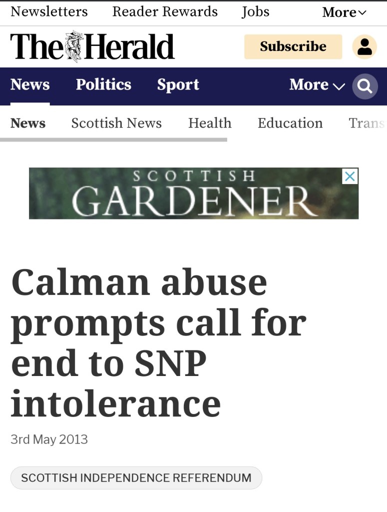 Calman, S. (2013, May 7). Calman abuse prompts call to end SNP intolerance. The Herald.https://www.heraldscotland.com/news/13102866.calman-abuse-prompts-call-end-snp-intolerance/